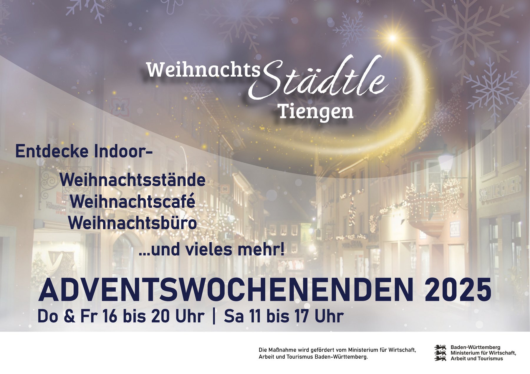 Ab Donnerstag, 27. November, bekommt Tiengen eine besondere Portion Weihnachtszauber: Vier derzeit ungenutzte Ladengeschäfte werden zu festlich gestalteten Indoor-Weihnachtsständen. Die Förderung erfolgt über das Sofortprogramm Einzelhandel Innenstadt des Ministeriums für Wirtschaft, Arbeit und Tourismus Baden-Württemberg.